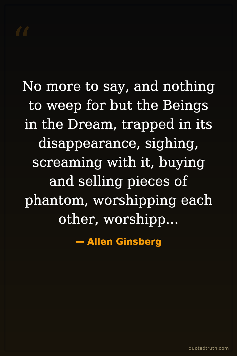 No more to say, and nothing to weep for but the Beings in the Dream, trapped in its disappearance, sighing, screaming with it, buying and selling pieces of phantom, worshipping each other, worshipping the God included in it all—longing or inevitability? —while it lasts, a Vision—anything more?