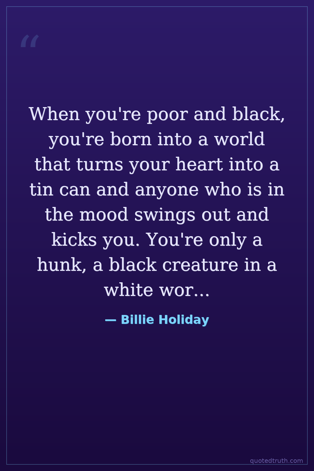 When you're poor and black, you're born into a world that turns your heart into a tin can and anyone who is in the mood swings out and kicks you. You're only a hunk, a black creature in a white world that thinks you're just a skin without a soul. — Billie Holiday Modern Jazz vocalist