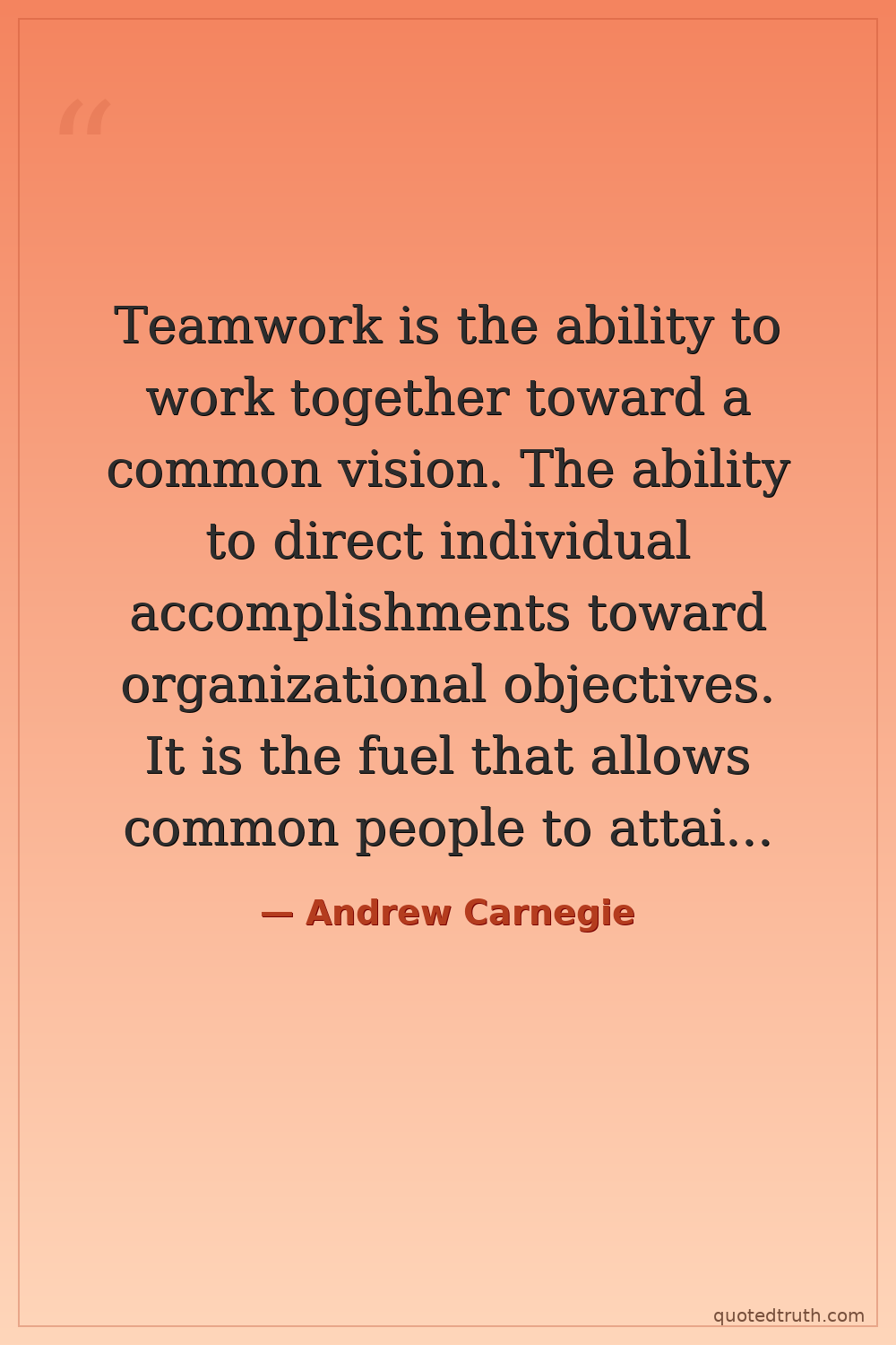 Teamwork is the ability to work together toward a common vision. The ability to direct individual accomplishments toward organizational objectives. It is the fuel that allows common people to attain uncommon results.