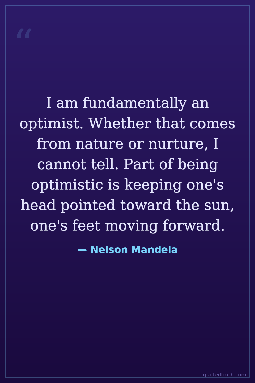I am fundamentally an optimist. Whether that comes from nature or nurture, I cannot tell. Part of being optimistic is keeping one's head pointed toward the sun, one's feet moving forward.