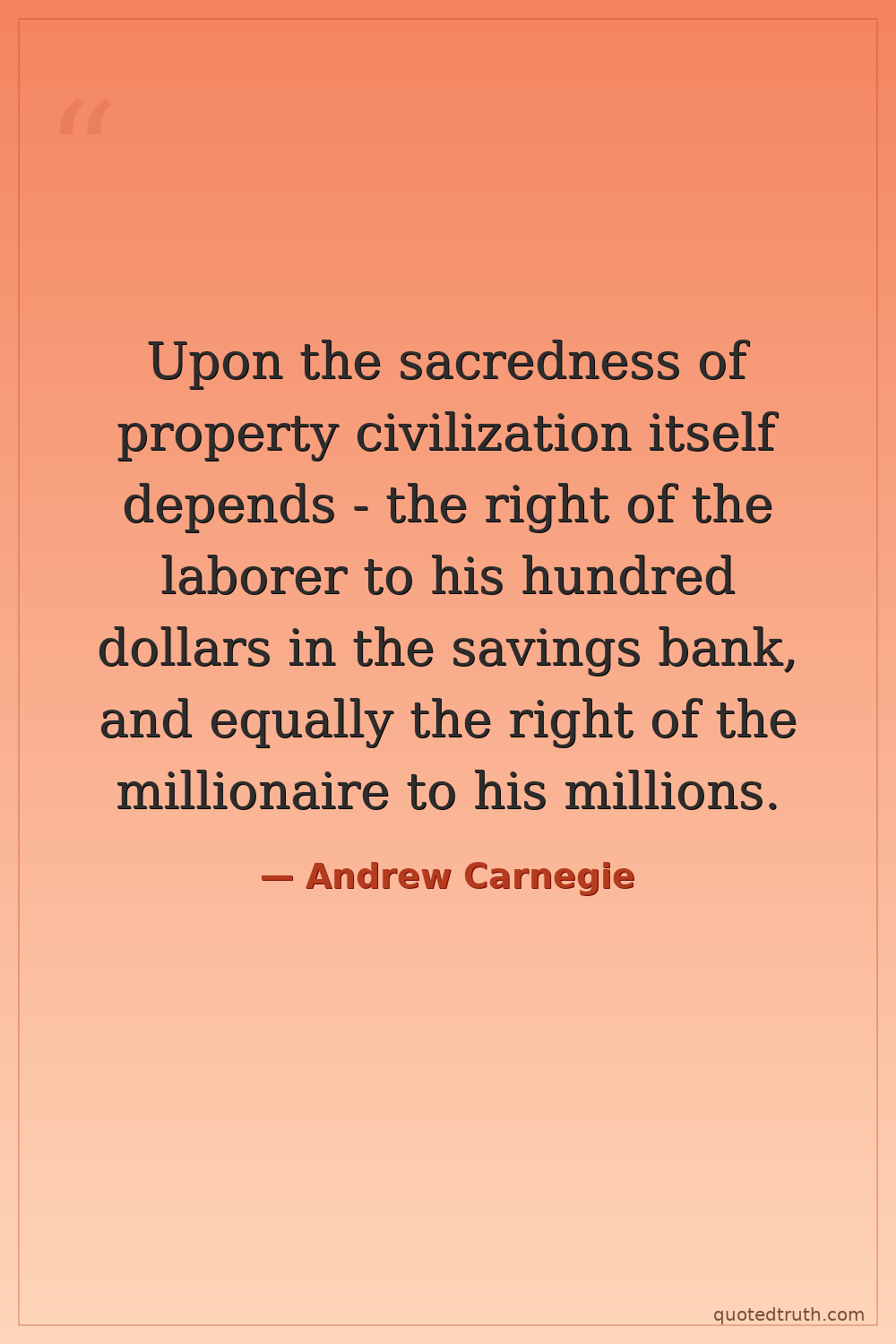 Upon the sacredness of property civilization itself depends - the right of the laborer to his hundred dollars in the savings bank, and equally the right of the millionaire to his millions.