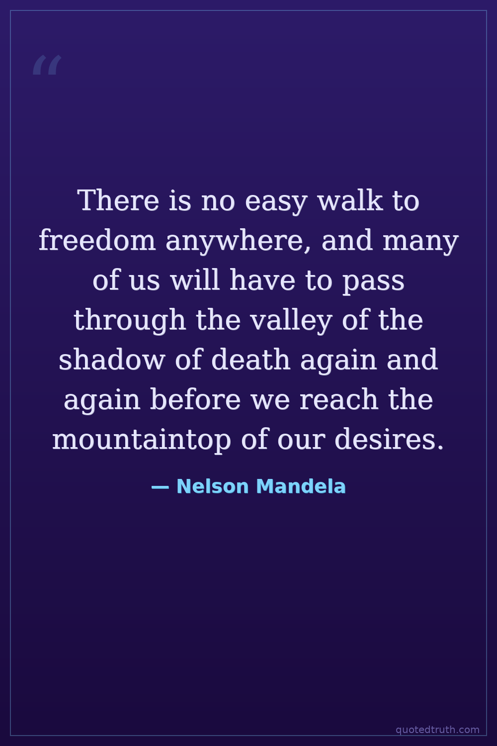 There is no easy walk to freedom anywhere, and many of us will have to pass through the valley of the shadow of death again and again before we reach the mountaintop of our desires.