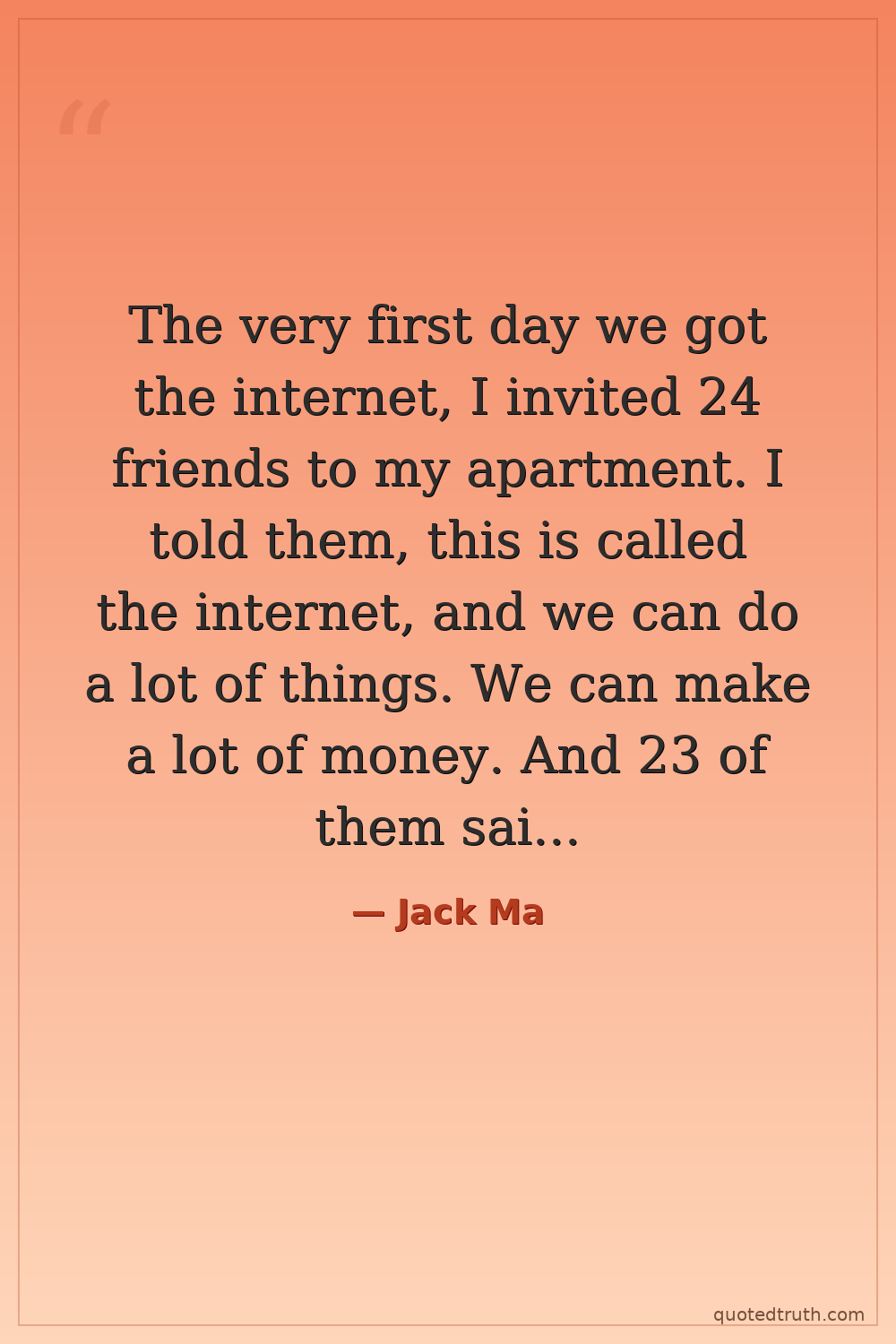 The very first day we got the internet, I invited 24 friends to my apartment. I told them, this is called the internet, and we can do a lot of things. We can make a lot of money. And 23 of them said, 'Forget it.' One guy said, 'Let's try it.' — Jack Ma Contemporary Alibaba founder