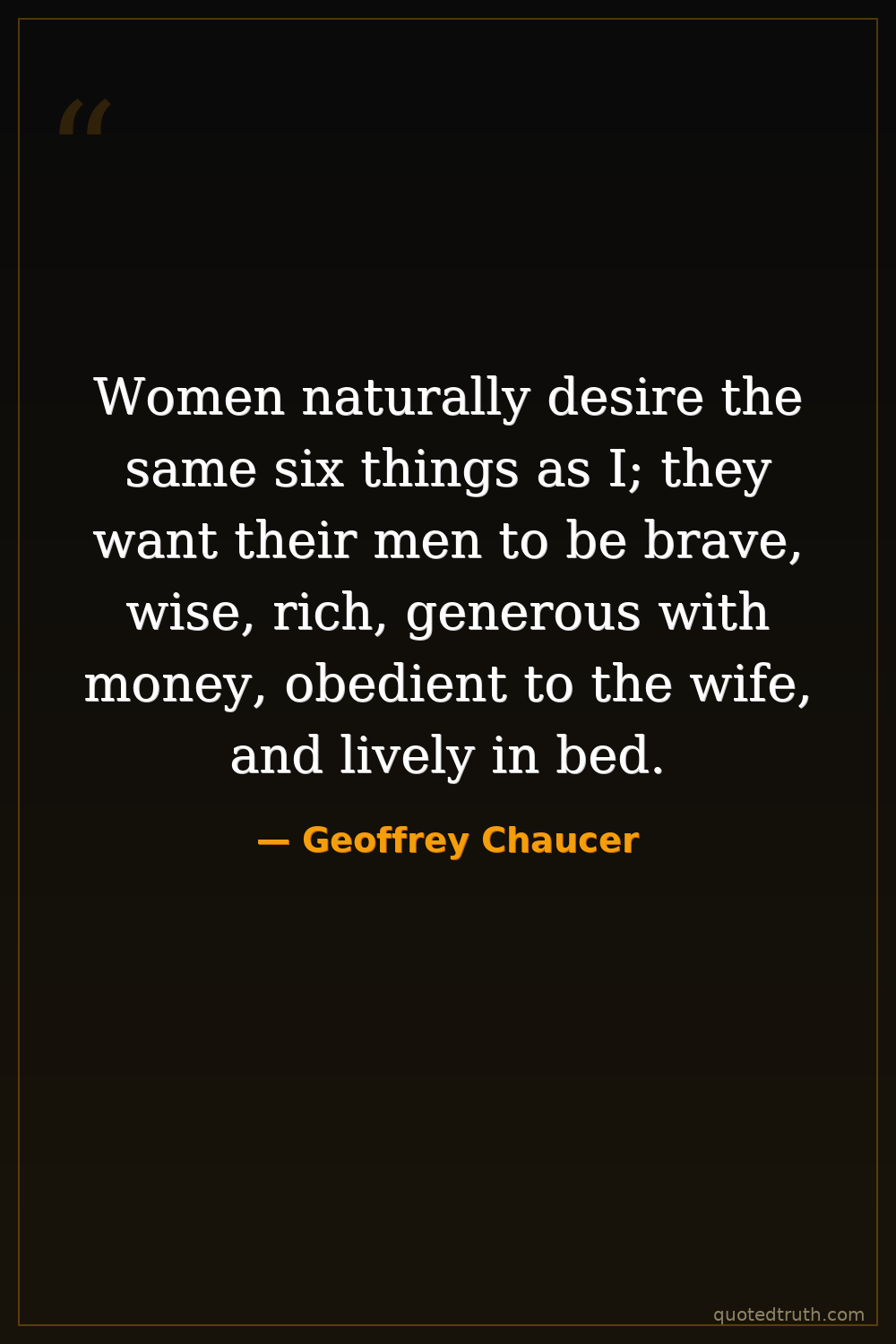 Women naturally desire the same six things as I; they want their men to be brave, wise, rich, generous with money, obedient to the wife, and lively in bed.