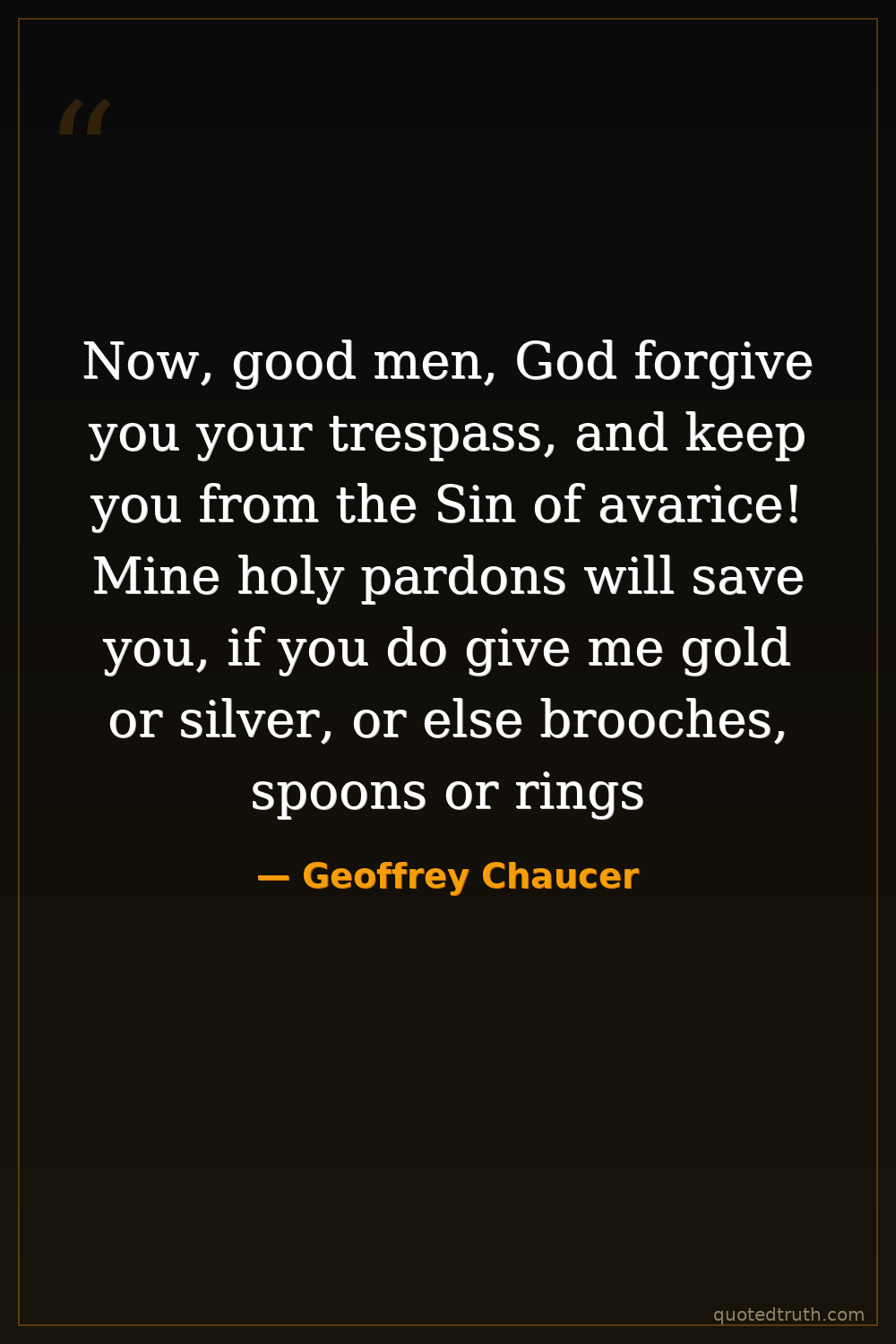 Now, good men, God forgive you your trespass, and keep you from the Sin of avarice! Mine holy pardons will save you, if you do give me gold or silver, or else brooches, spoons or rings