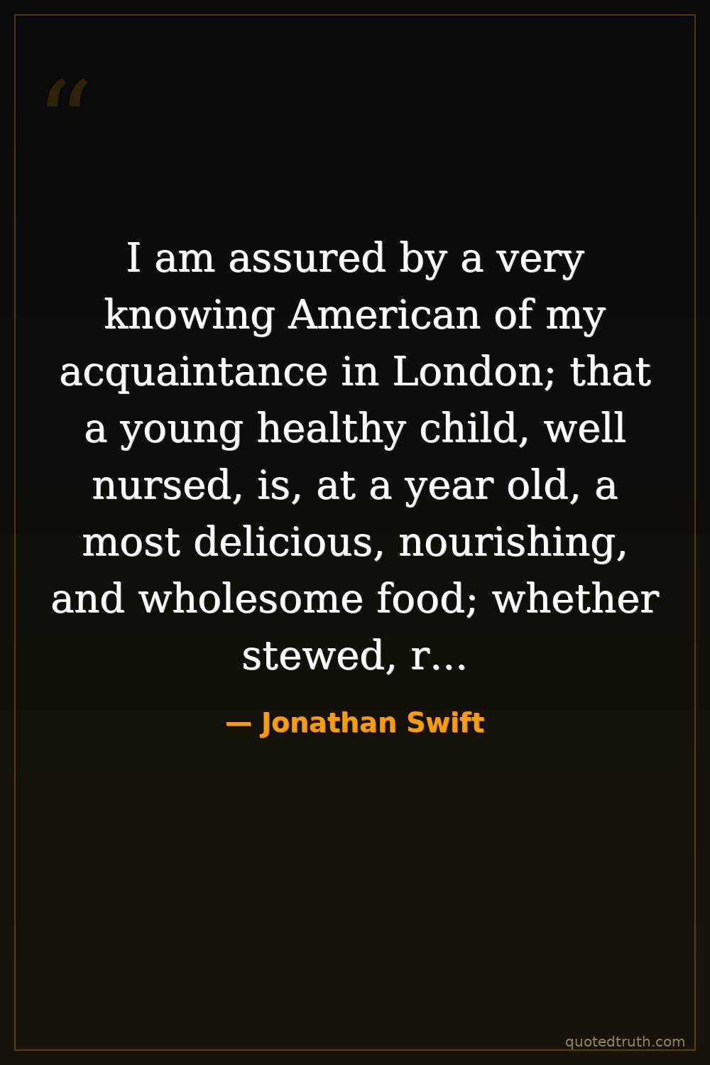 I am assured by a very knowing American of my acquaintance in London; that a young healthy child, well nursed, is, at a year old, a most delicious, nourishing, and wholesome food; whether stewed, roasted, baked or boiled, and I make no doubt, that it will equally serve in a fricassee, or ragout.