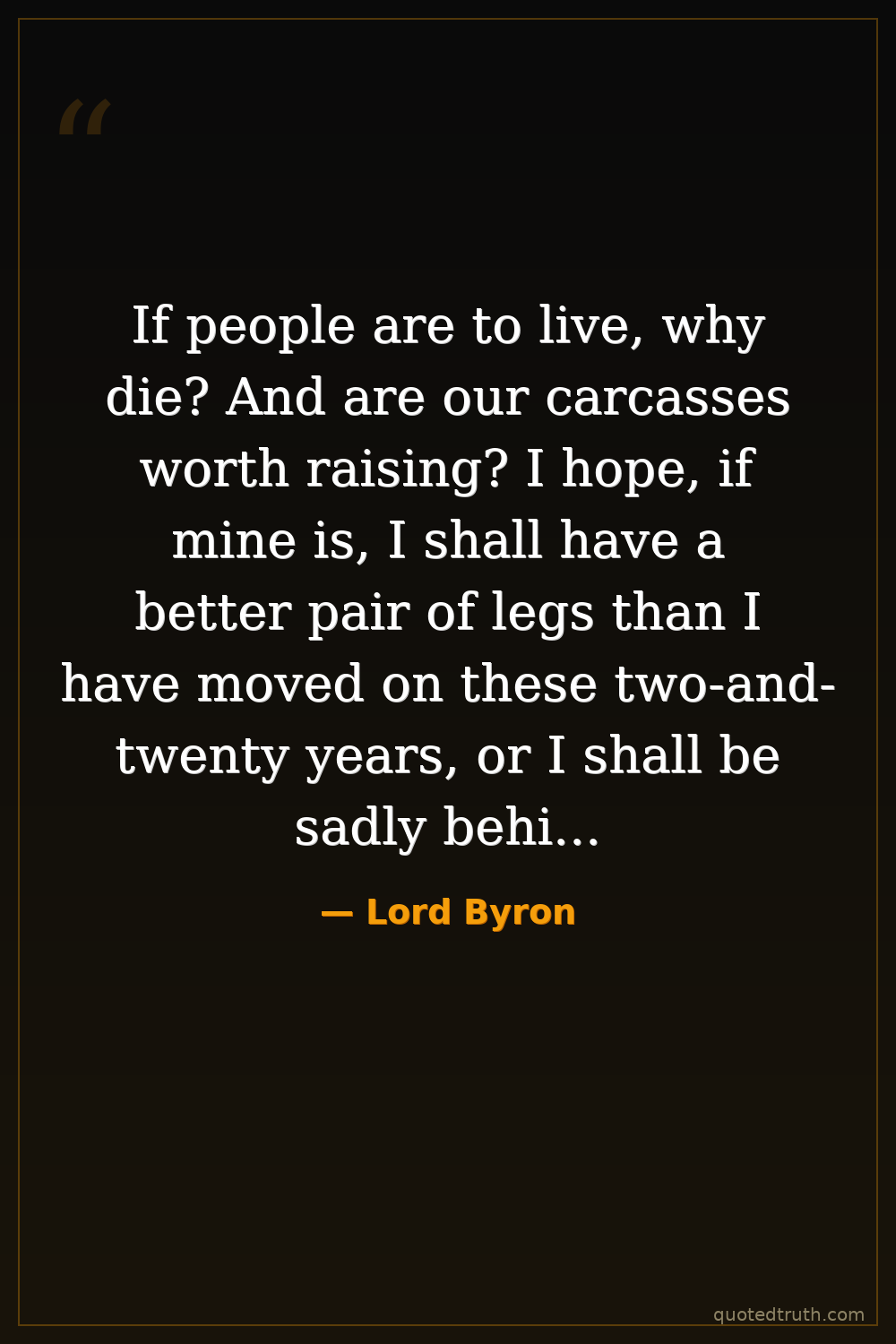 If people are to live, why die? And are our carcasses worth raising? I hope, if mine is, I shall have a better pair of legs than I have moved on these two-and-twenty years, or I shall be sadly behind in the squeeze into Paradise.