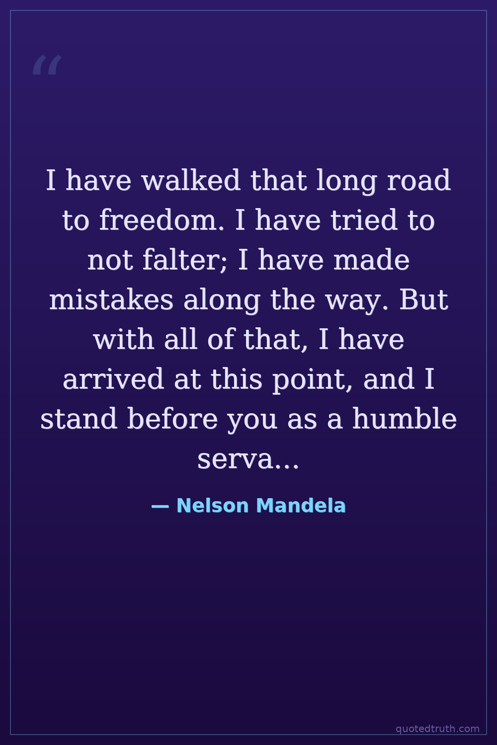 I have walked that long road to freedom. I have tried to not falter; I have made mistakes along the way. But with all of that, I have arrived at this point, and I stand before you as a humble servant of you, the people.