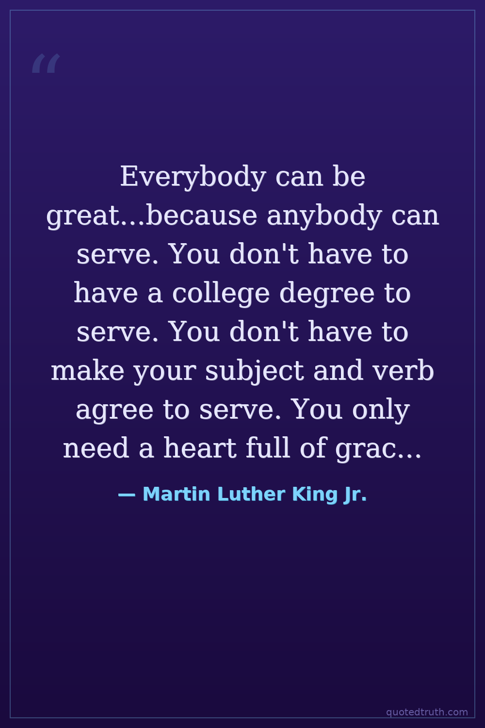 Everybody can be great...because anybody can serve. You don't have to have a college degree to serve. You don't have to make your subject and verb agree to serve. You only need a heart full of grace. A soul generated by love.