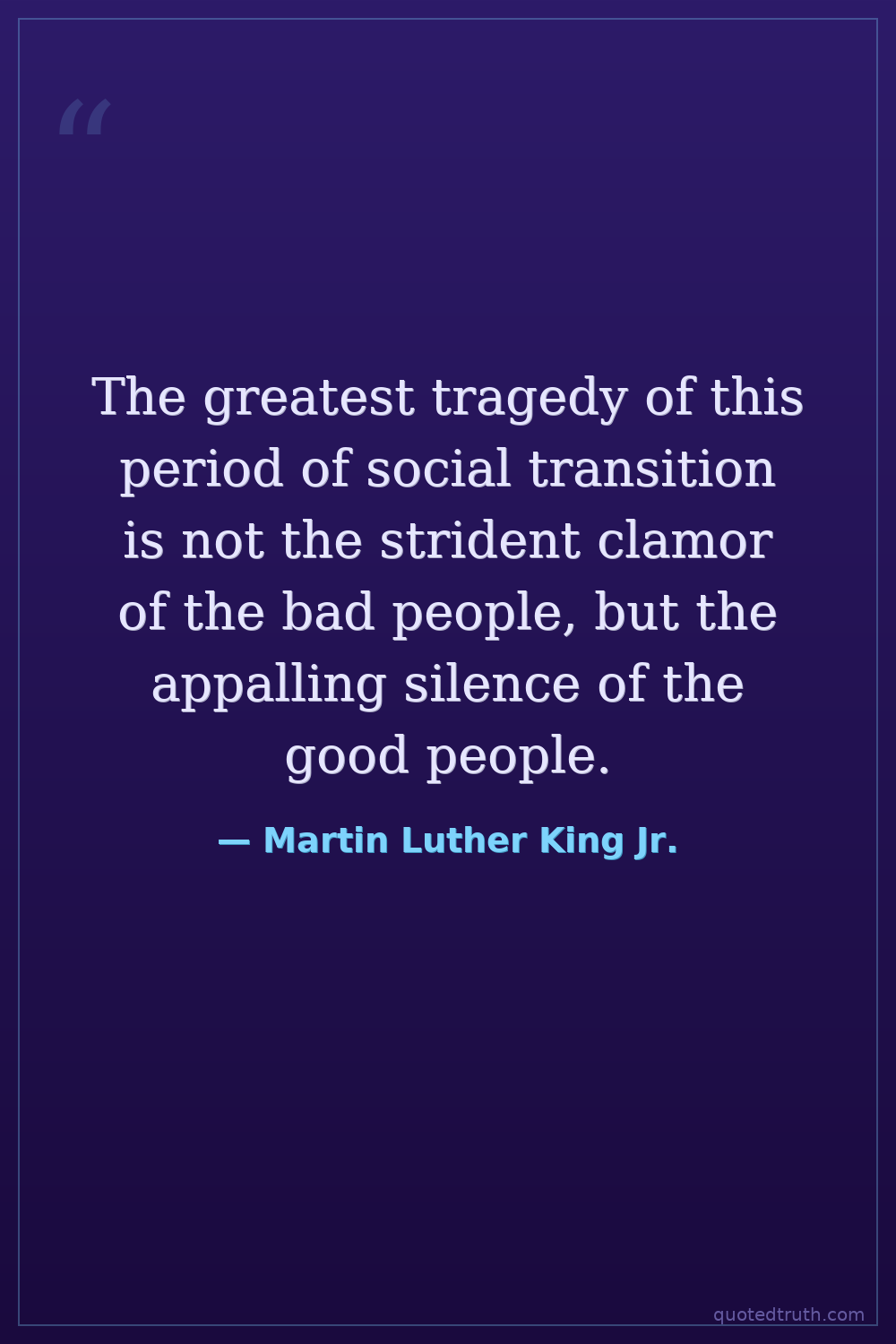 The greatest tragedy of this period of social transition is not the strident clamor of the bad people, but the appalling silence of the good people.