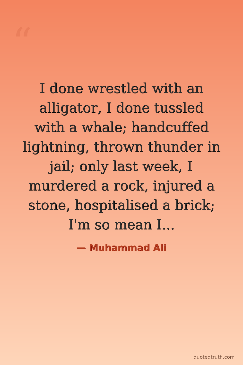 I done wrestled with an alligator, I done tussled with a whale; handcuffed lightning, thrown thunder in jail; only last week, I murdered a rock, injured a stone, hospitalised a brick; I'm so mean I make medicine sick. — Muhammad Ali Modern Boxer, activist, greatest of all time