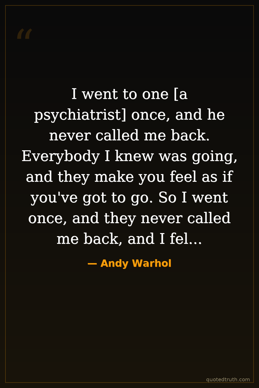 I went to one [a psychiatrist] once, and he never called me back. Everybody I knew was going, and they make you feel as if you've got to go. So I went once, and they never called me back, and I felt so funny. But then I guess someone came along and took me out to a movie, or I got a new hat or something.