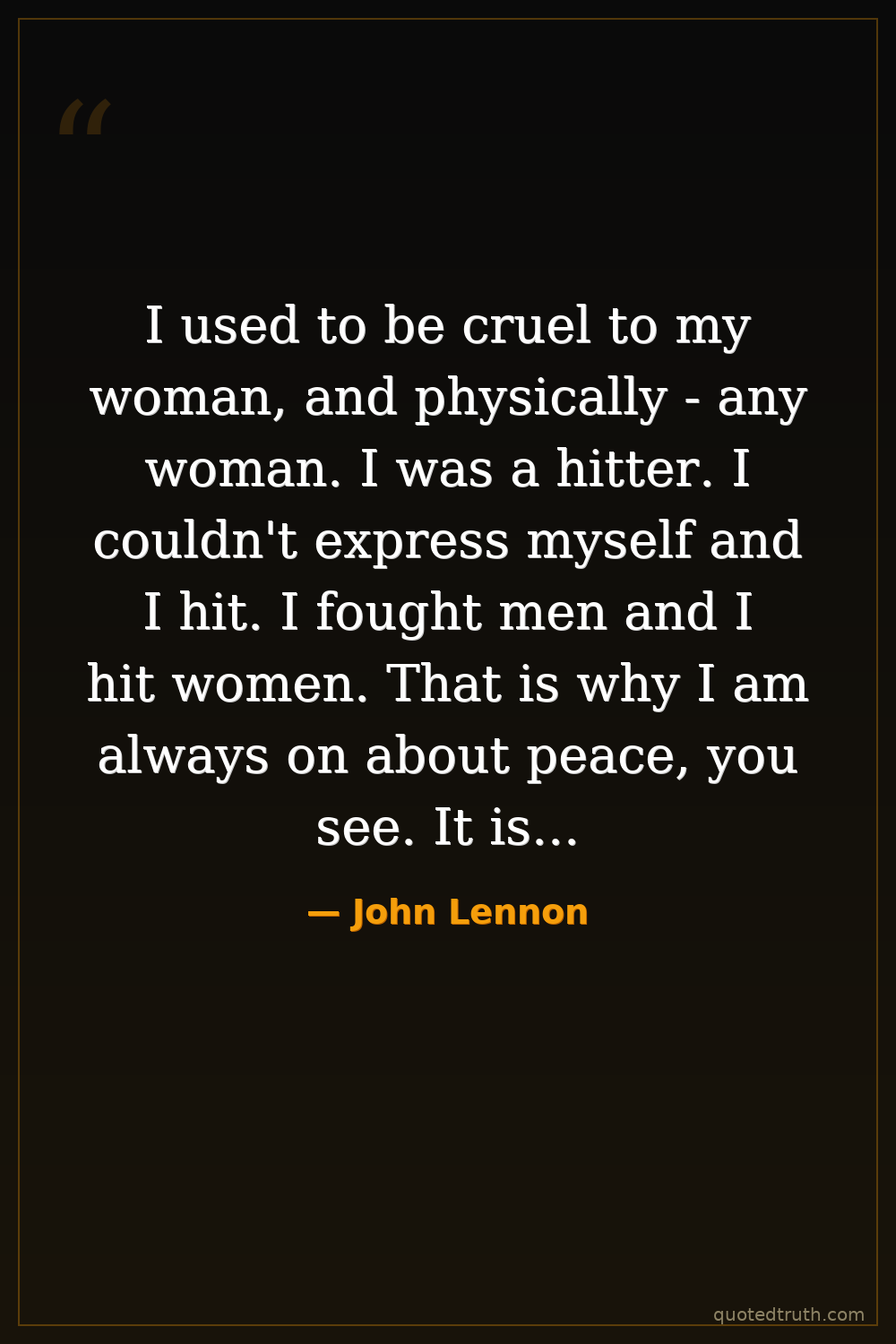 I used to be cruel to my woman, and physically - any woman. I was a hitter. I couldn't express myself and I hit. I fought men and I hit women. That is why I am always on about peace, you see. It is the most violent people who go for love and peace. Everything's the opposite. But I sincerely believe in love and peace. I am a violent man who has learned not to be violent and regrets his violence. I will have to be a lot older before I can face in public how I treated women as a youngster.