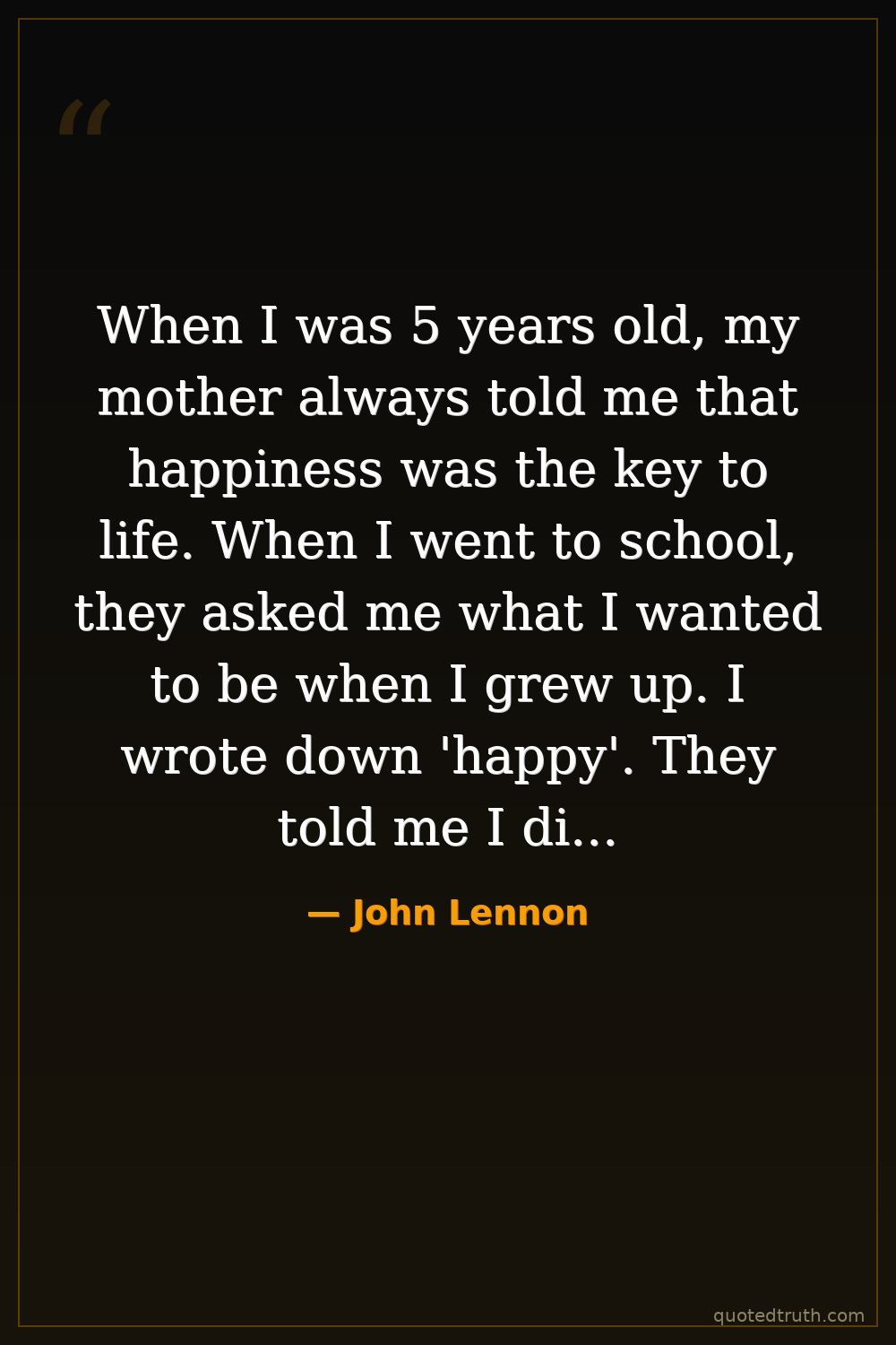 When I was 5 years old, my mother always told me that happiness was the key to life. When I went to school, they asked me what I wanted to be when I grew up. I wrote down 'happy'. They told me I didn't understand the assignment, and I told them they didn't understand life.