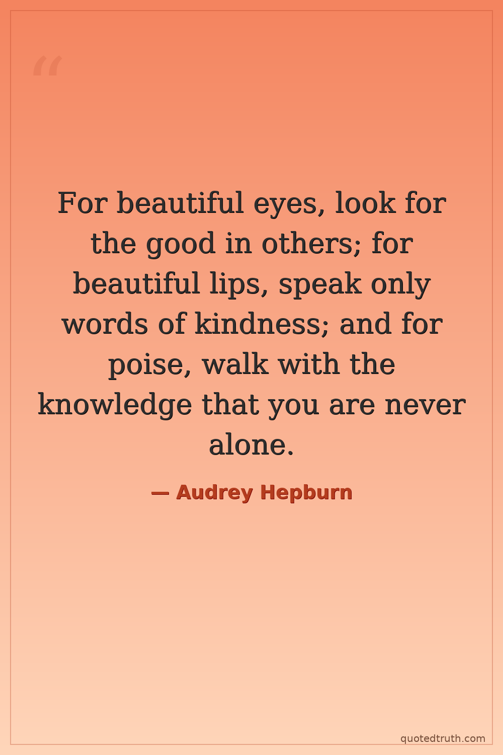 For beautiful eyes, look for the good in others; for beautiful lips, speak only words of kindness; and for poise, walk with the knowledge that you are never alone.
