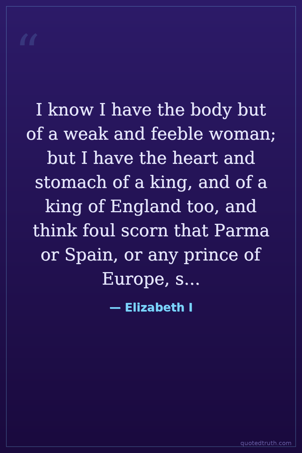 I know I have the body but of a weak and feeble woman; but I have the heart and stomach of a king, and of a king of England too, and think foul scorn that Parma or Spain, or any prince of Europe, should dare to invade the borders of my realm.