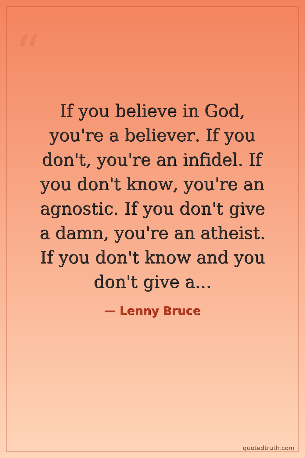 If you believe in God, you're a believer. If you don't, you're an infidel. If you don't know, you're an agnostic. If you don't give a damn, you're an atheist. If you don't know and you don't give a damn, you're a philosopher.