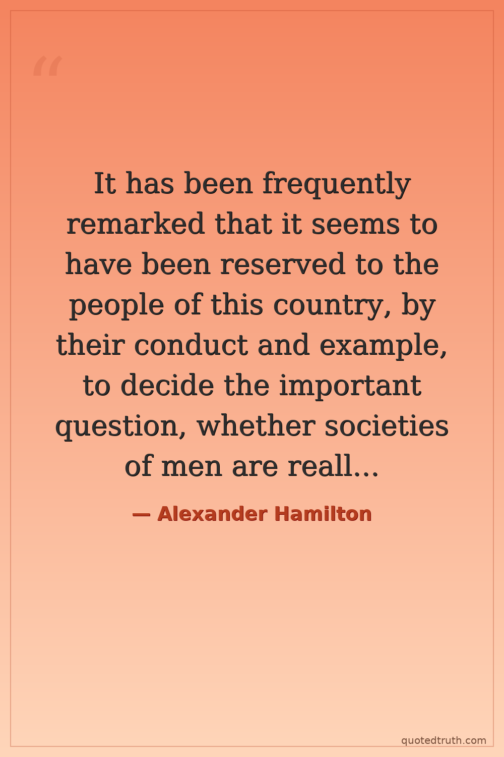 It has been frequently remarked that it seems to have been reserved to the people of this country, by their conduct and example, to decide the important question, whether societies of men are really capable or not of establishing good government from reflection and choice, or whether they are forever destined to depend for their political constitutions on accident and force.