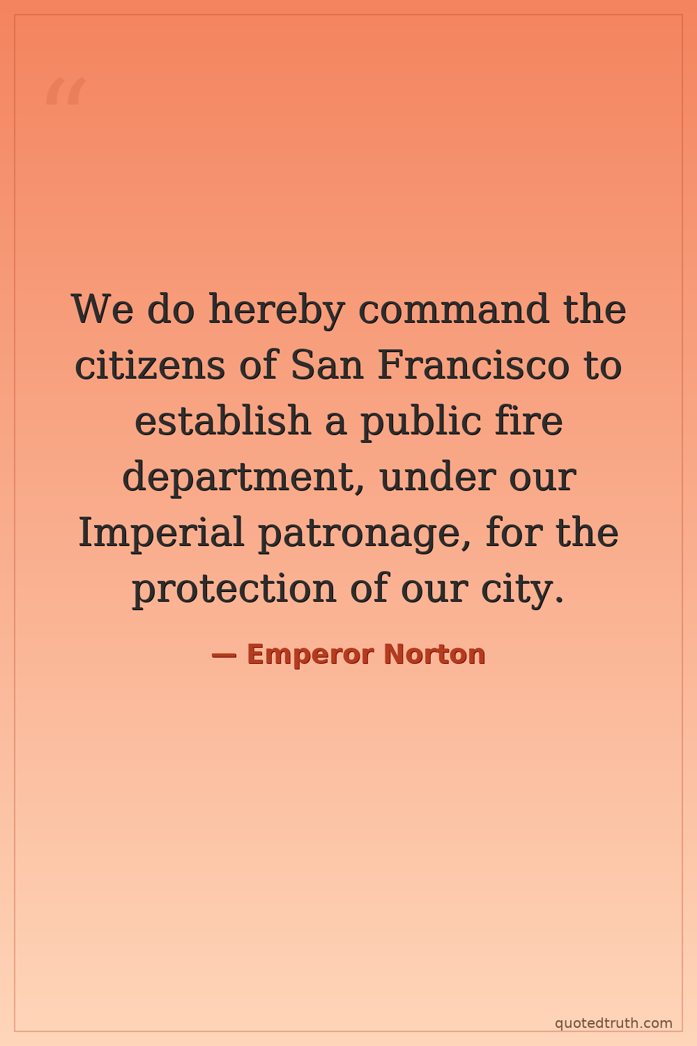 We do hereby command the citizens of San Francisco to establish a public fire department, under our Imperial patronage, for the protection of our city.