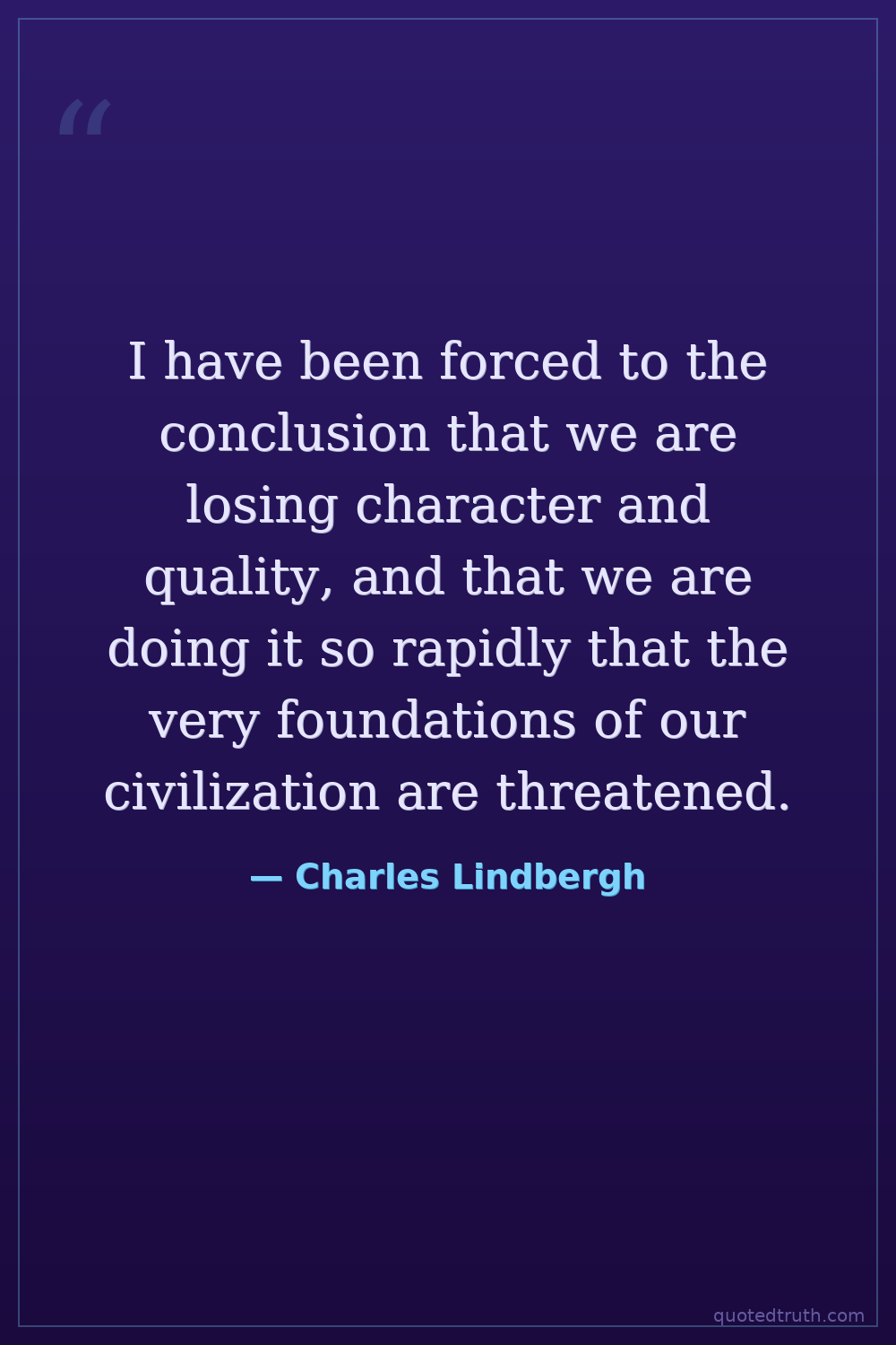 I have been forced to the conclusion that we are losing character and quality, and that we are doing it so rapidly that the very foundations of our civilization are threatened.