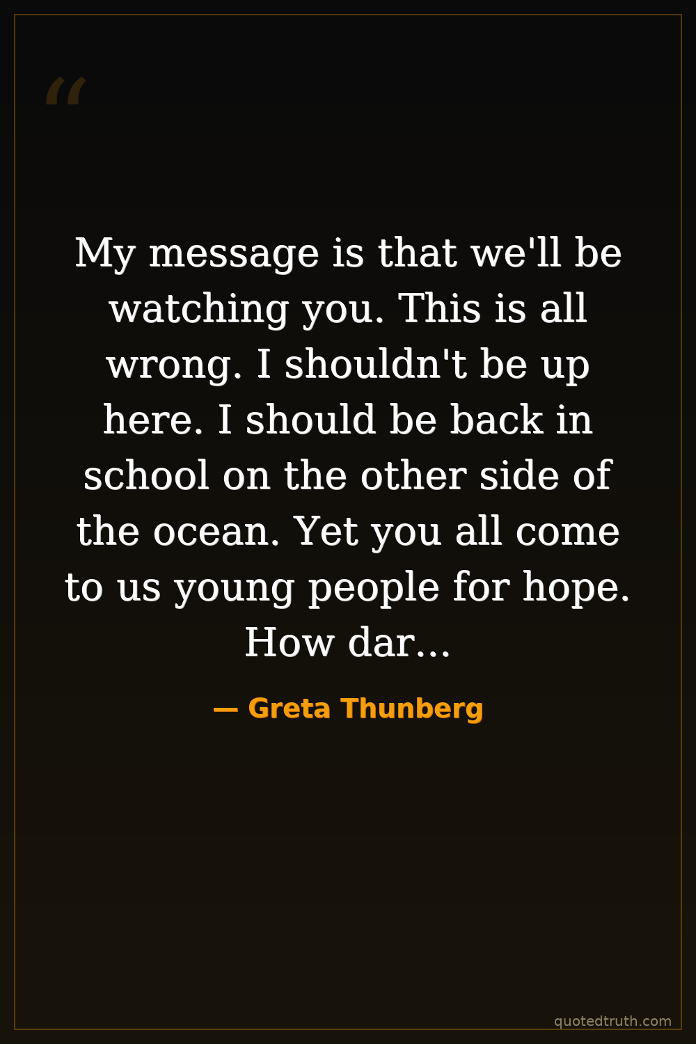 My message is that we'll be watching you. This is all wrong. I shouldn't be up here. I should be back in school on the other side of the ocean. Yet you all come to us young people for hope. How dare you!