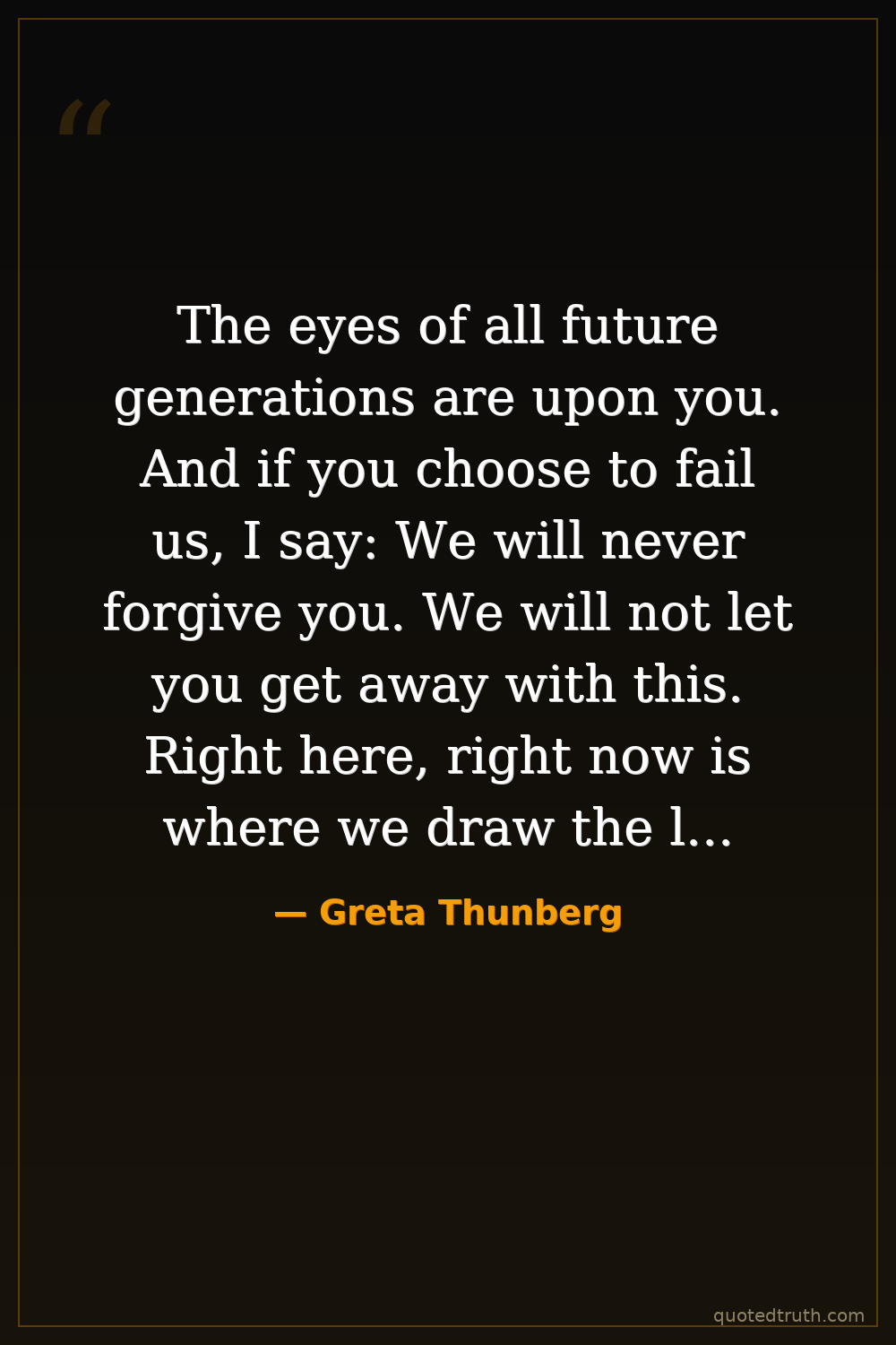 The eyes of all future generations are upon you. And if you choose to fail us, I say: We will never forgive you. We will not let you get away with this. Right here, right now is where we draw the line. The world is waking up. And change is coming, whether you like it or not.