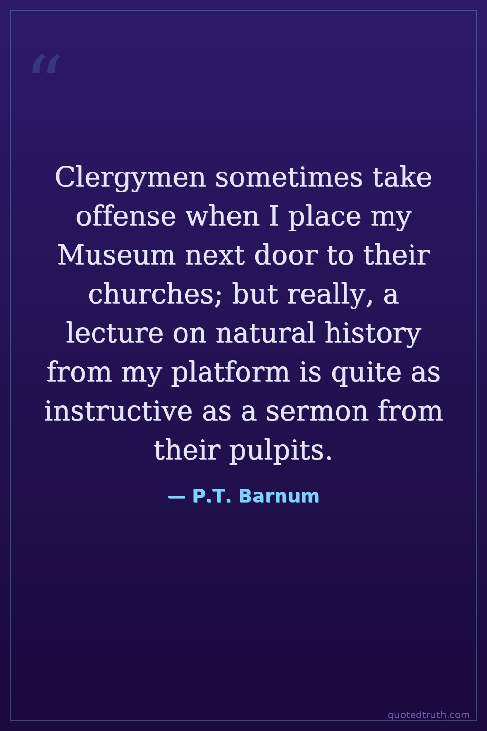 Clergymen sometimes take offense when I place my Museum next door to their churches; but really, a lecture on natural history from my platform is quite as instructive as a sermon from their pulpits.