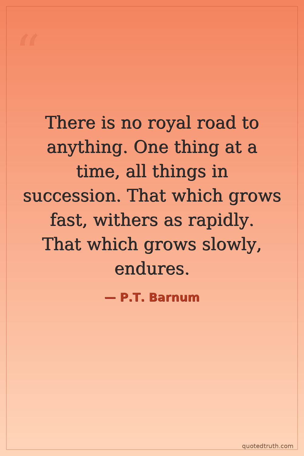 There is no royal road to anything. One thing at a time, all things in succession. That which grows fast, withers as rapidly. That which grows slowly, endures.