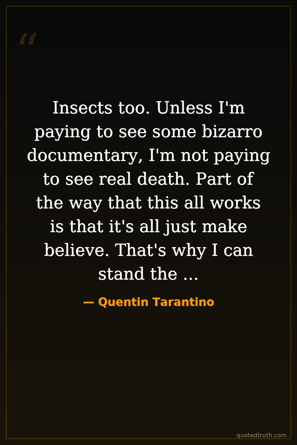 Insects too. Unless I'm paying to see some bizarro documentary, I'm not paying to see real death. Part of the way that this all works is that it's all just make believe. That's why I can stand the violent scenes, cause we're all just f**king around. — Quentin Tarantino Contemporary Filmmaker