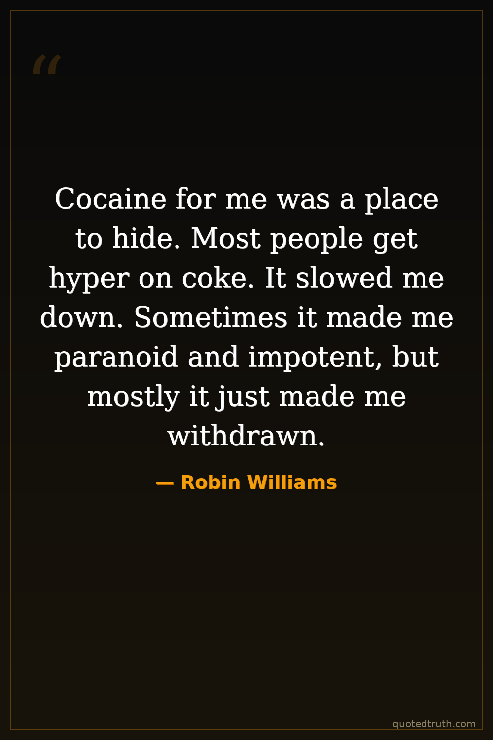 Cocaine for me was a place to hide. Most people get hyper on coke. It slowed me down. Sometimes it made me paranoid and impotent, but mostly it just made me withdrawn.