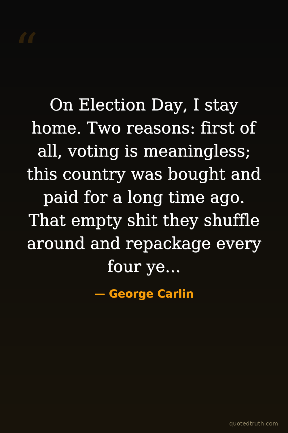 On Election Day, I stay home. Two reasons: first of all, voting is meaningless; this country was bought and paid for a long time ago. That empty shit they shuffle around and repackage every four years doesn't mean a thing. Second, I don't vote, because I firmly believe that if you vote, you have no right to complain.