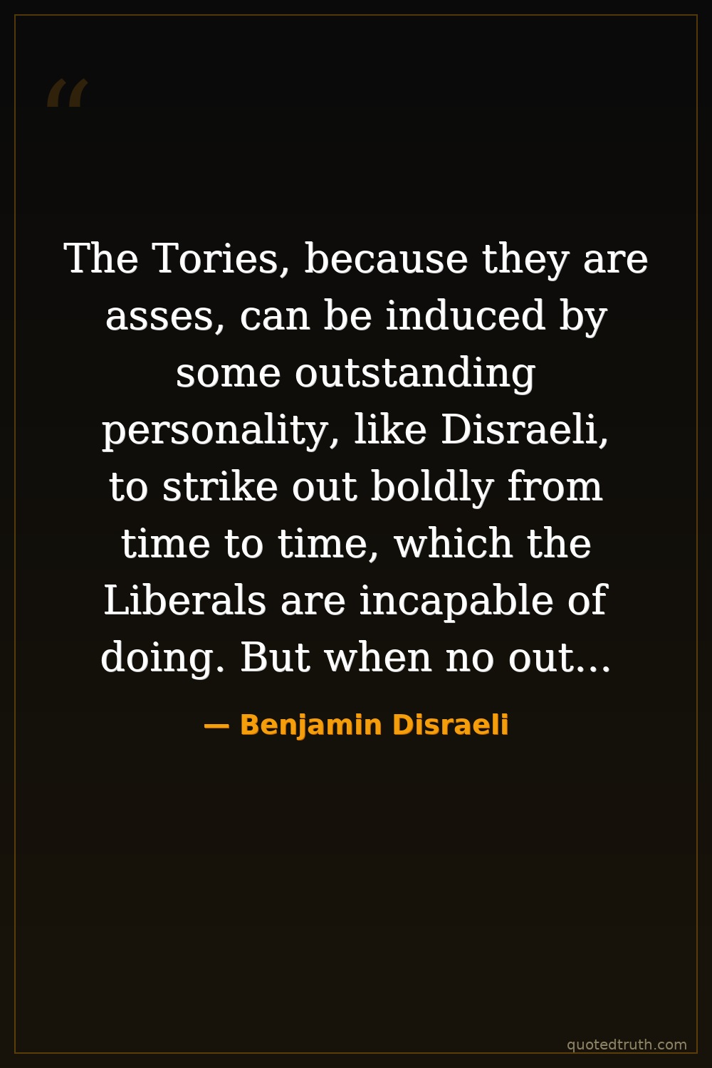 The Tories, because they are asses, can be induced by some outstanding personality, like Disraeli, to strike out boldly from time to time, which the Liberals are incapable of doing. But when no outstanding personality is available they fall under the sway of asses, as is the case just now.