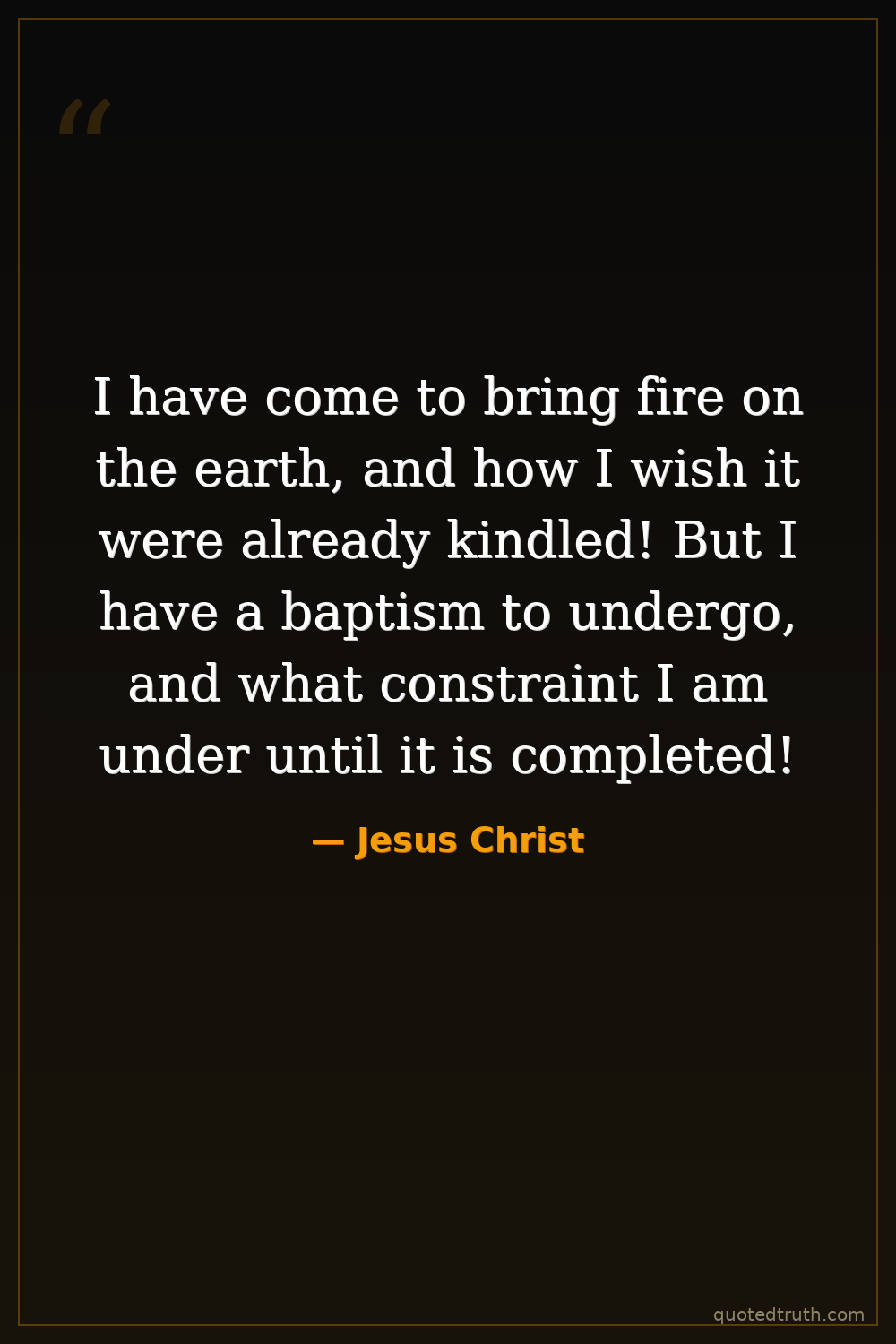 I have come to bring fire on the earth, and how I wish it were already kindled! But I have a baptism to undergo, and what constraint I am under until it is completed!