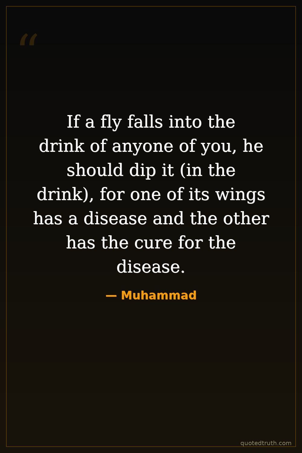If a fly falls into the drink of anyone of you, he should dip it (in the drink), for one of its wings has a disease and the other has the cure for the disease.