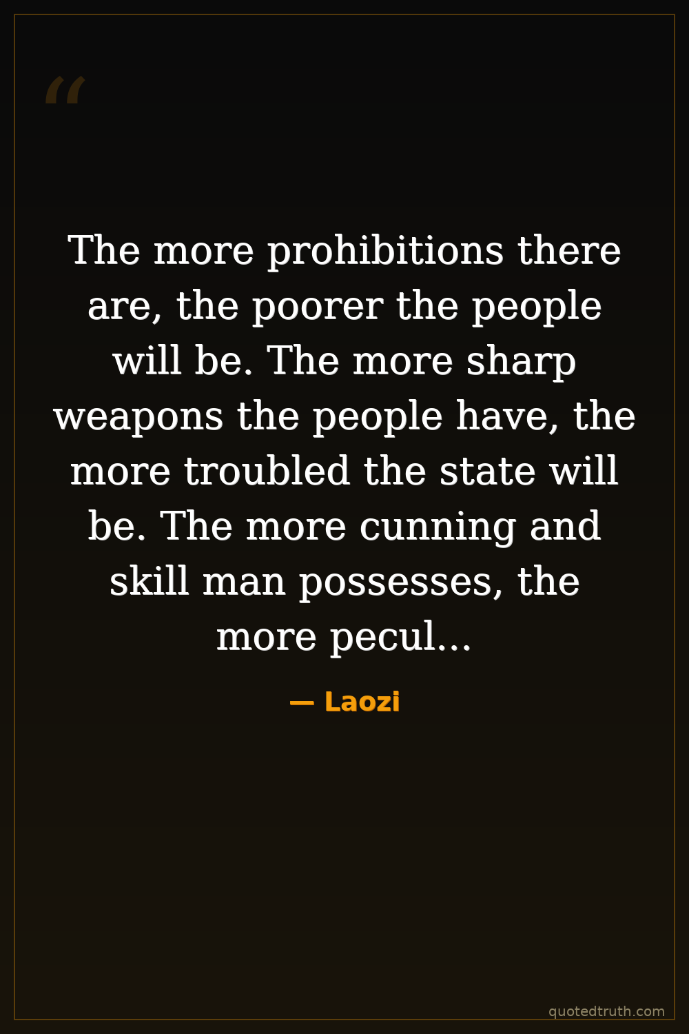 The more prohibitions there are, the poorer the people will be. The more sharp weapons the people have, the more troubled the state will be. The more cunning and skill man possesses, the more peculiar things will appear. The more laws and orders are promulgated, the more thieves and robbers there will be.