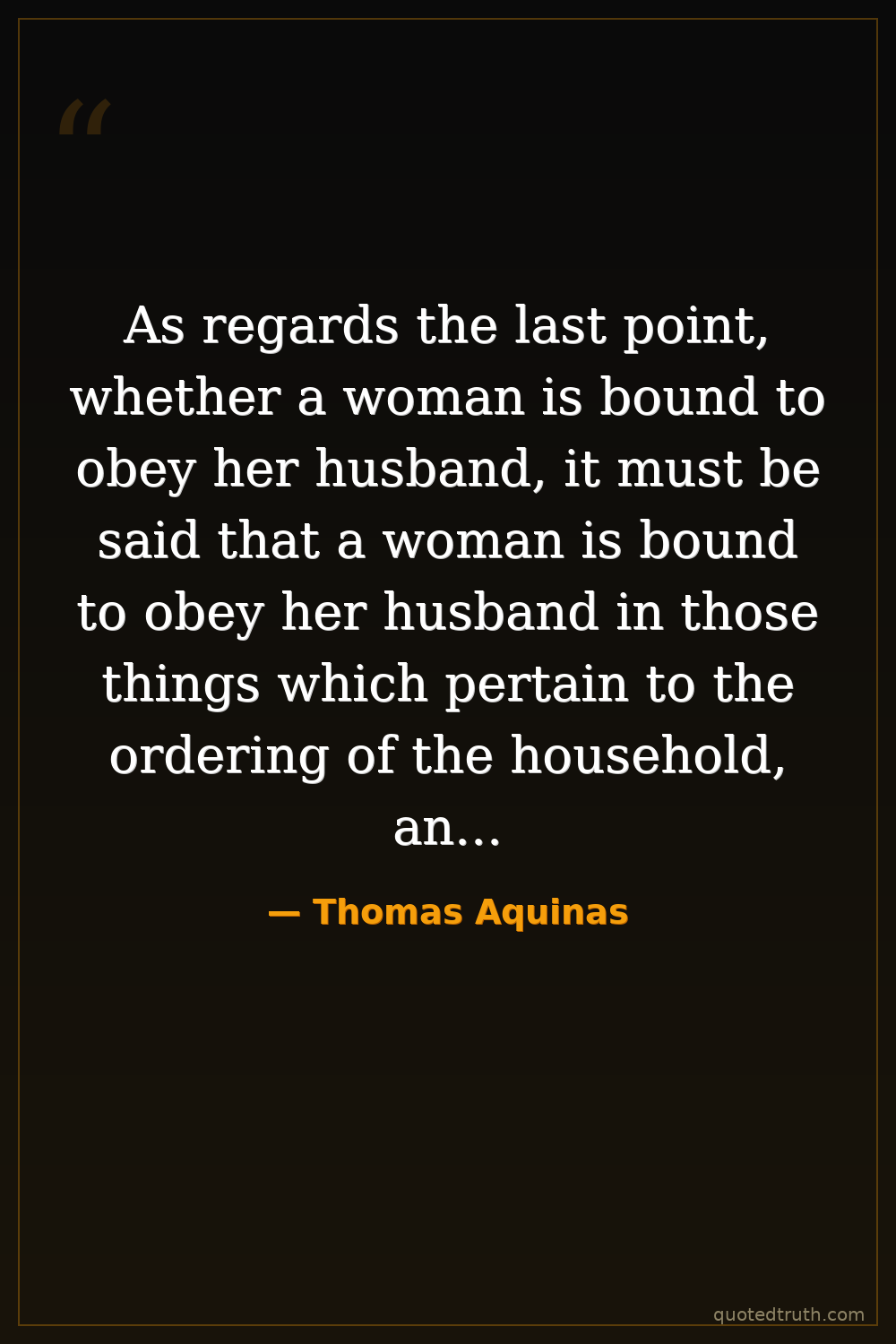 As regards the last point, whether a woman is bound to obey her husband, it must be said that a woman is bound to obey her husband in those things which pertain to the ordering of the household, and to the upbringing of children, and to the management of family affairs.