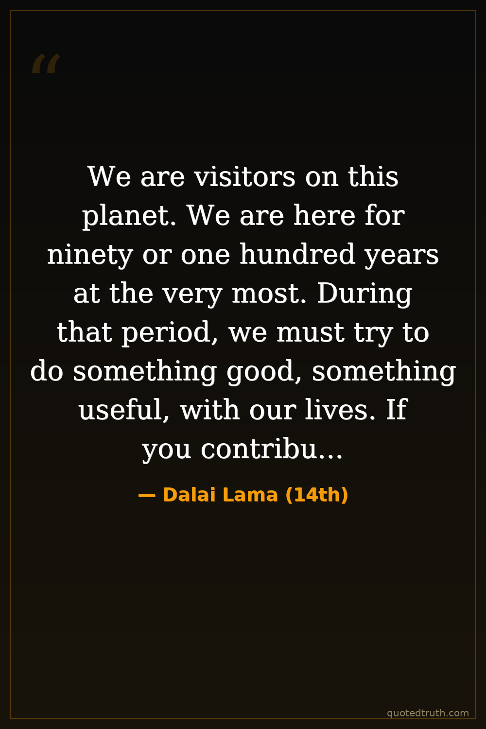 We are visitors on this planet. We are here for ninety or one hundred years at the very most. During that period, we must try to do something good, something useful, with our lives. If you contribute to other people's happiness, you will find the true meaning of life.