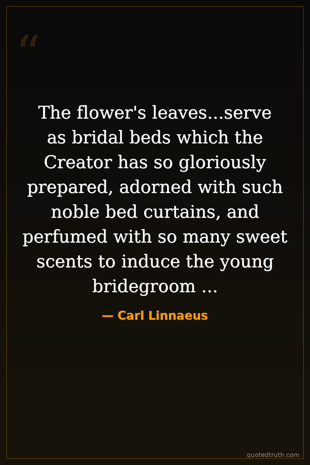 The flower's leaves...serve as bridal beds which the Creator has so gloriously prepared, adorned with such noble bed curtains, and perfumed with so many sweet scents to induce the young bridegroom to perform his nuptials with his beloved bride.