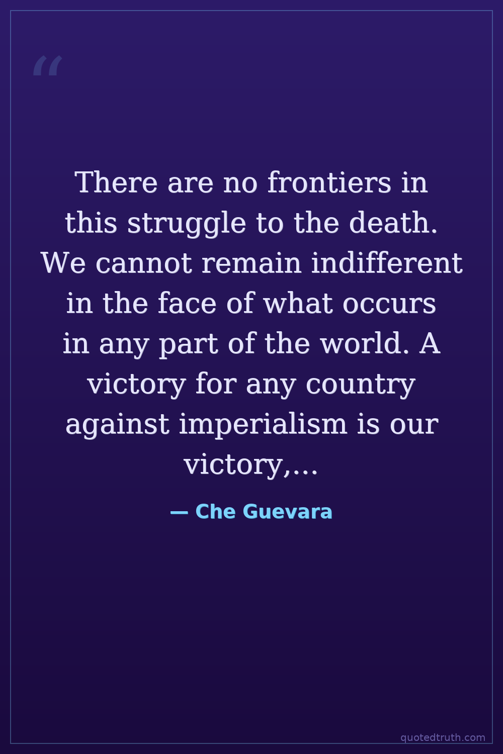 There are no frontiers in this struggle to the death. We cannot remain indifferent in the face of what occurs in any part of the world. A victory for any country against imperialism is our victory, just as any defeat of any country is our defeat.