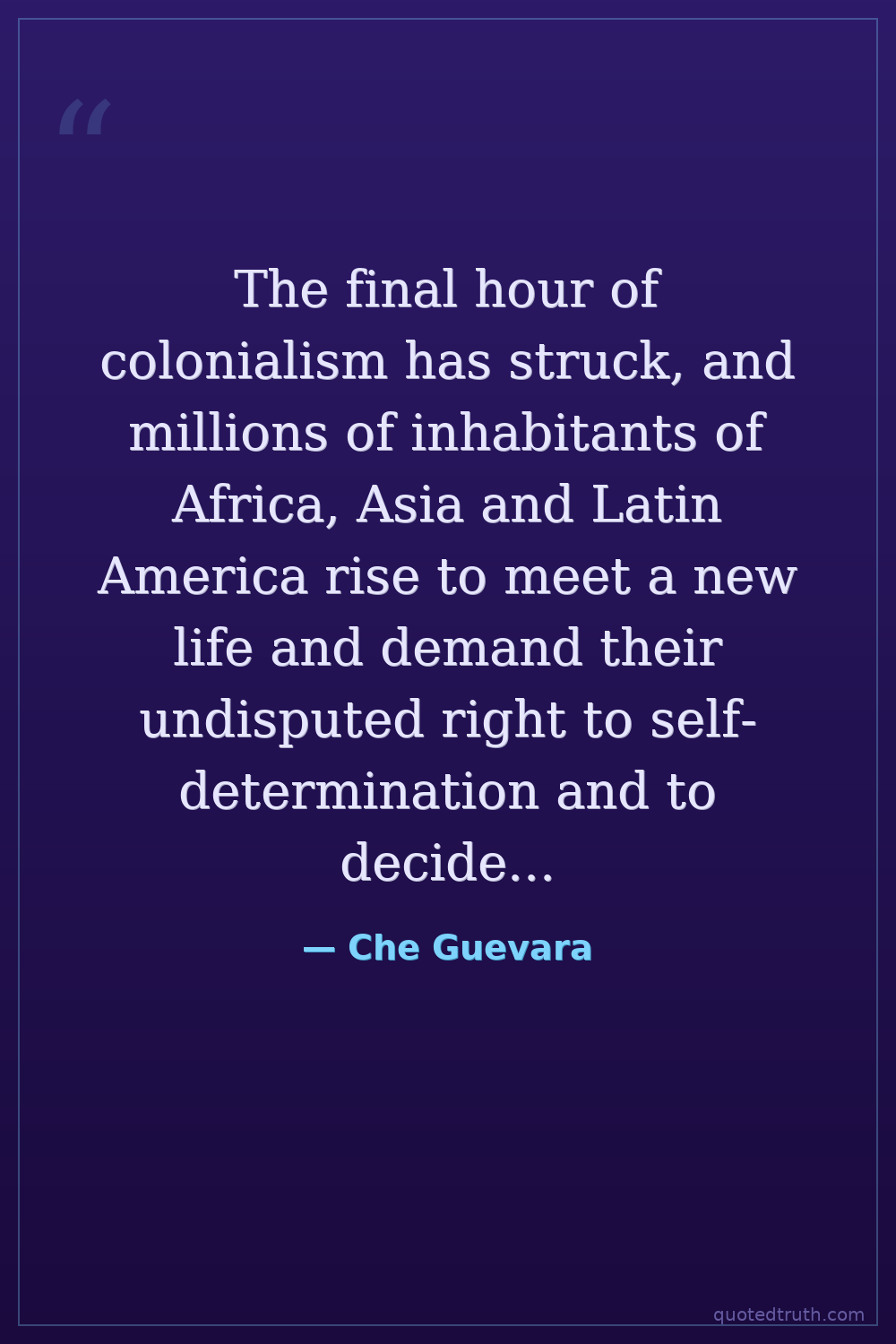 The final hour of colonialism has struck, and millions of inhabitants of Africa, Asia and Latin America rise to meet a new life and demand their undisputed right to self-determination and to decide their own destinies.