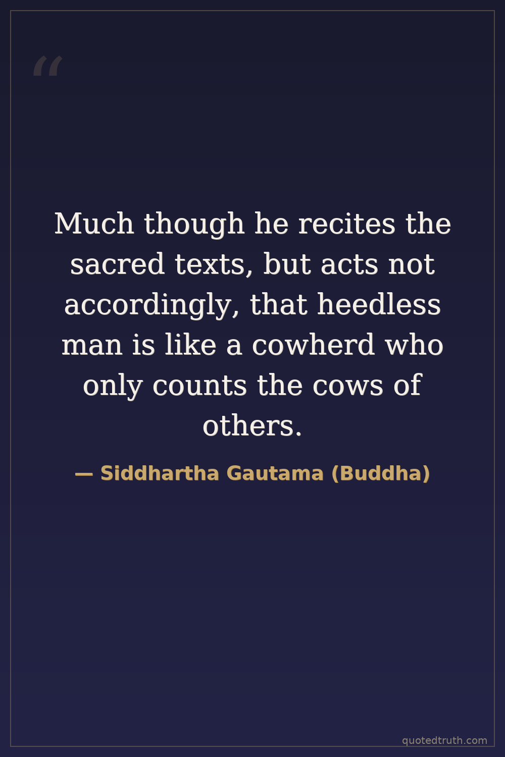 Much though he recites the sacred texts, but acts not accordingly, that heedless man is like a cowherd who only counts the cows of others.