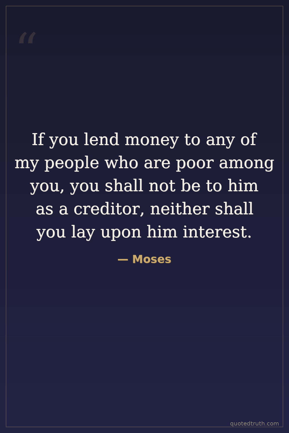 If you lend money to any of my people who are poor among you, you shall not be to him as a creditor, neither shall you lay upon him interest.