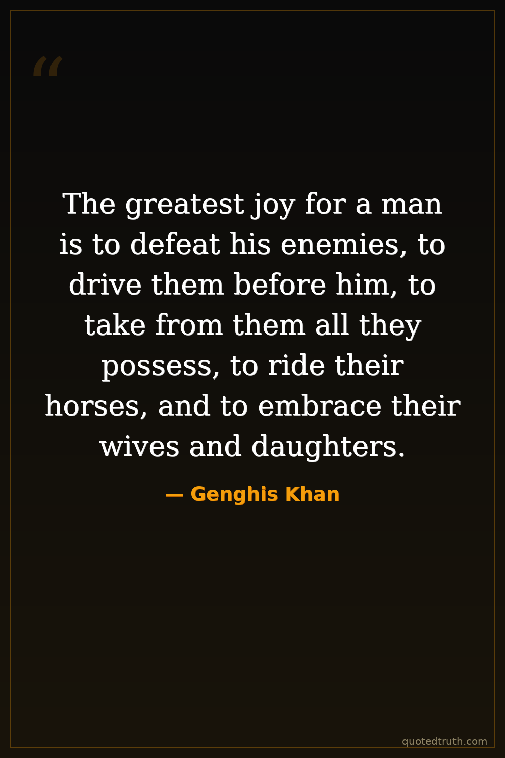The greatest joy for a man is to defeat his enemies, to drive them before him, to take from them all they possess, to ride their horses, and to embrace their wives and daughters.