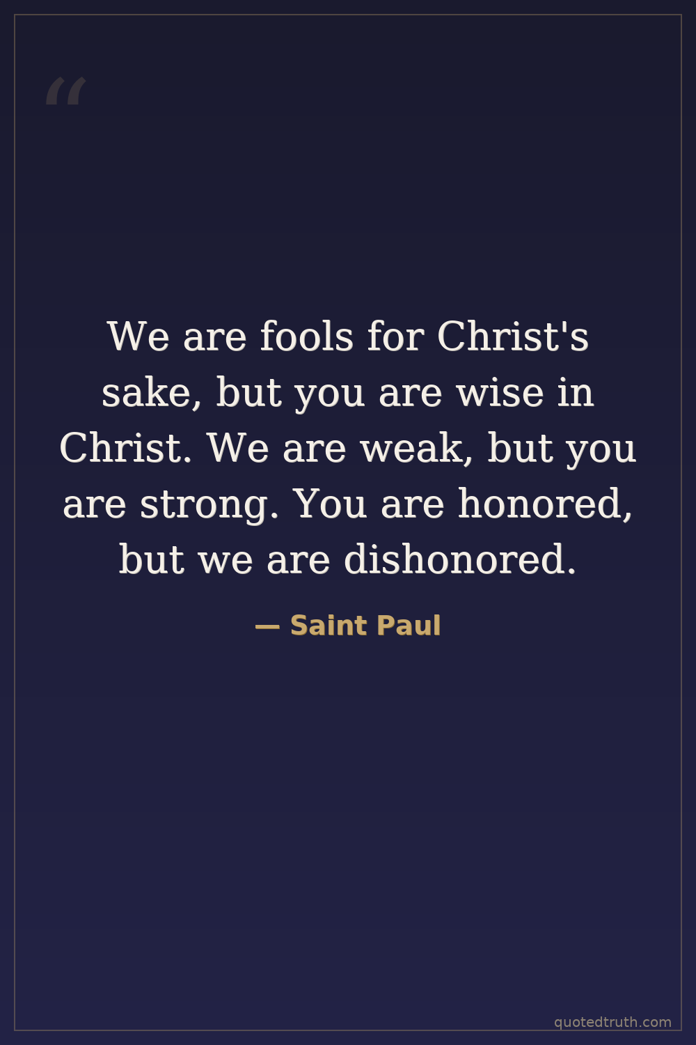 We are fools for Christ's sake, but you are wise in Christ. We are weak, but you are strong. You are honored, but we are dishonored.