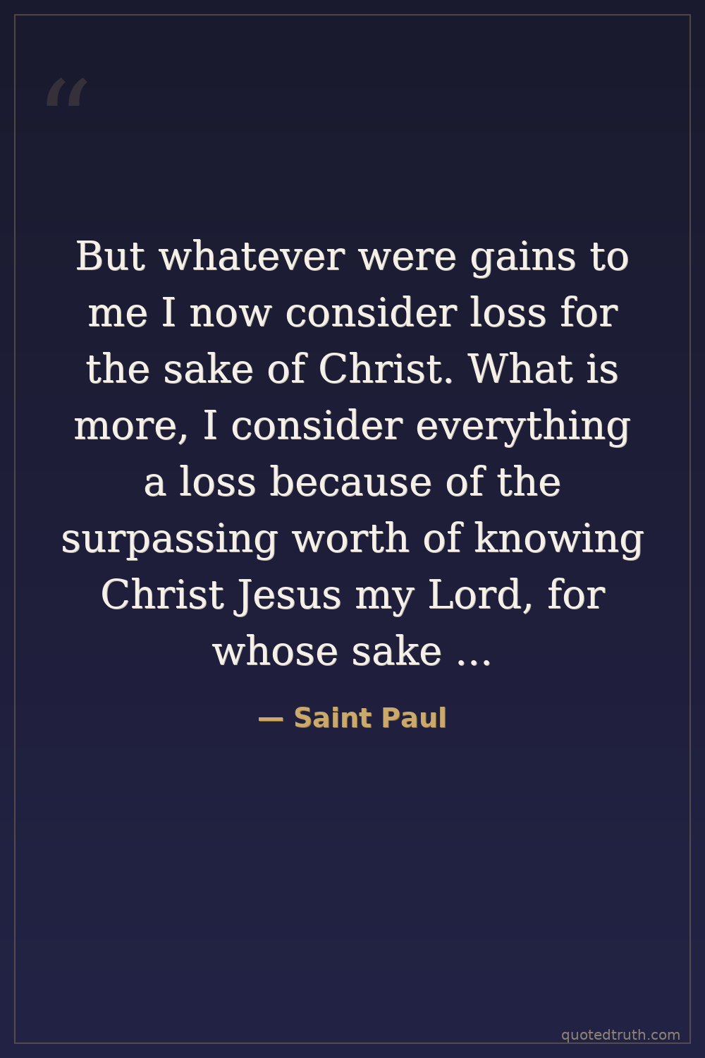 But whatever were gains to me I now consider loss for the sake of Christ. What is more, I consider everything a loss because of the surpassing worth of knowing Christ Jesus my Lord, for whose sake I have lost all things. I consider them garbage, that I may gain Christ.