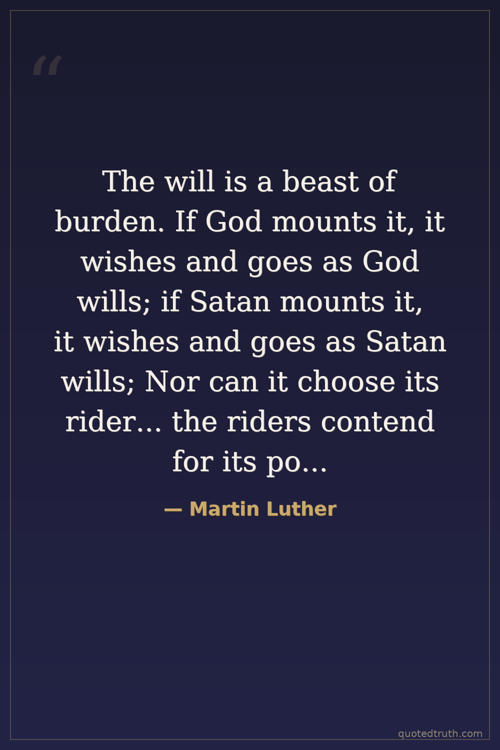 The will is a beast of burden. If God mounts it, it wishes and goes as God wills; if Satan mounts it, it wishes and goes as Satan wills; Nor can it choose its rider... the riders contend for its possession.
