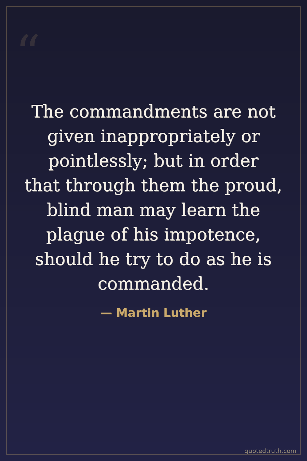 The commandments are not given inappropriately or pointlessly; but in order that through them the proud, blind man may learn the plague of his impotence, should he try to do as he is commanded.
