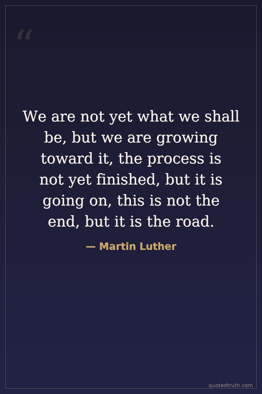 We are not yet what we shall be, but we are growing toward it, the process is not yet finished, but it is going on, this is not the end, but it is the road.