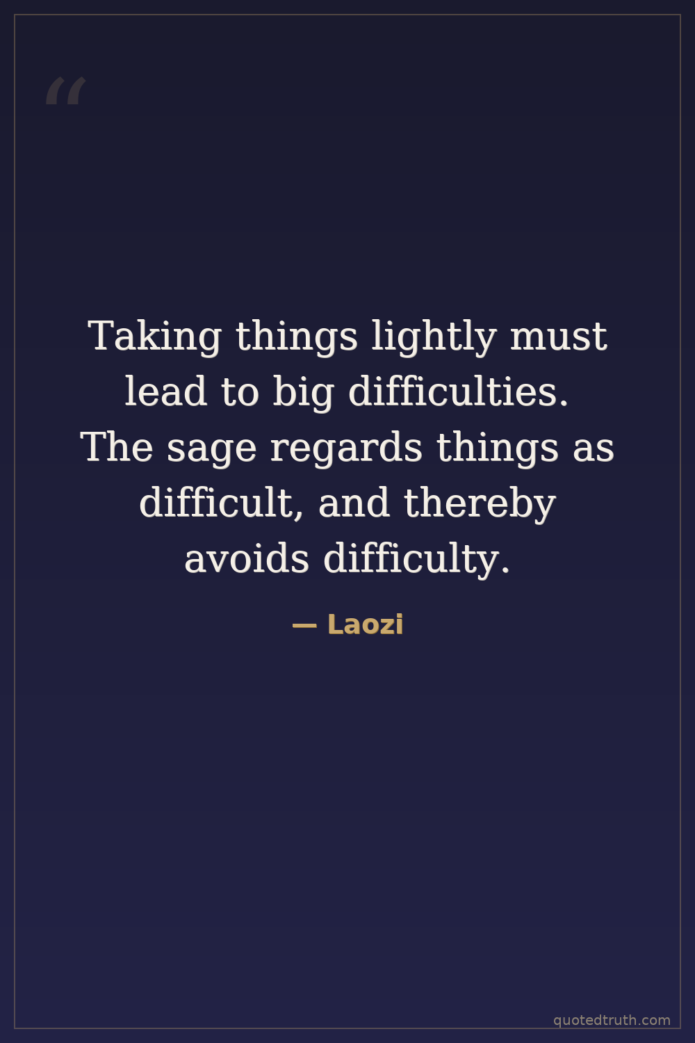 Taking things lightly must lead to big difficulties. The sage regards things as difficult, and thereby avoids difficulty.