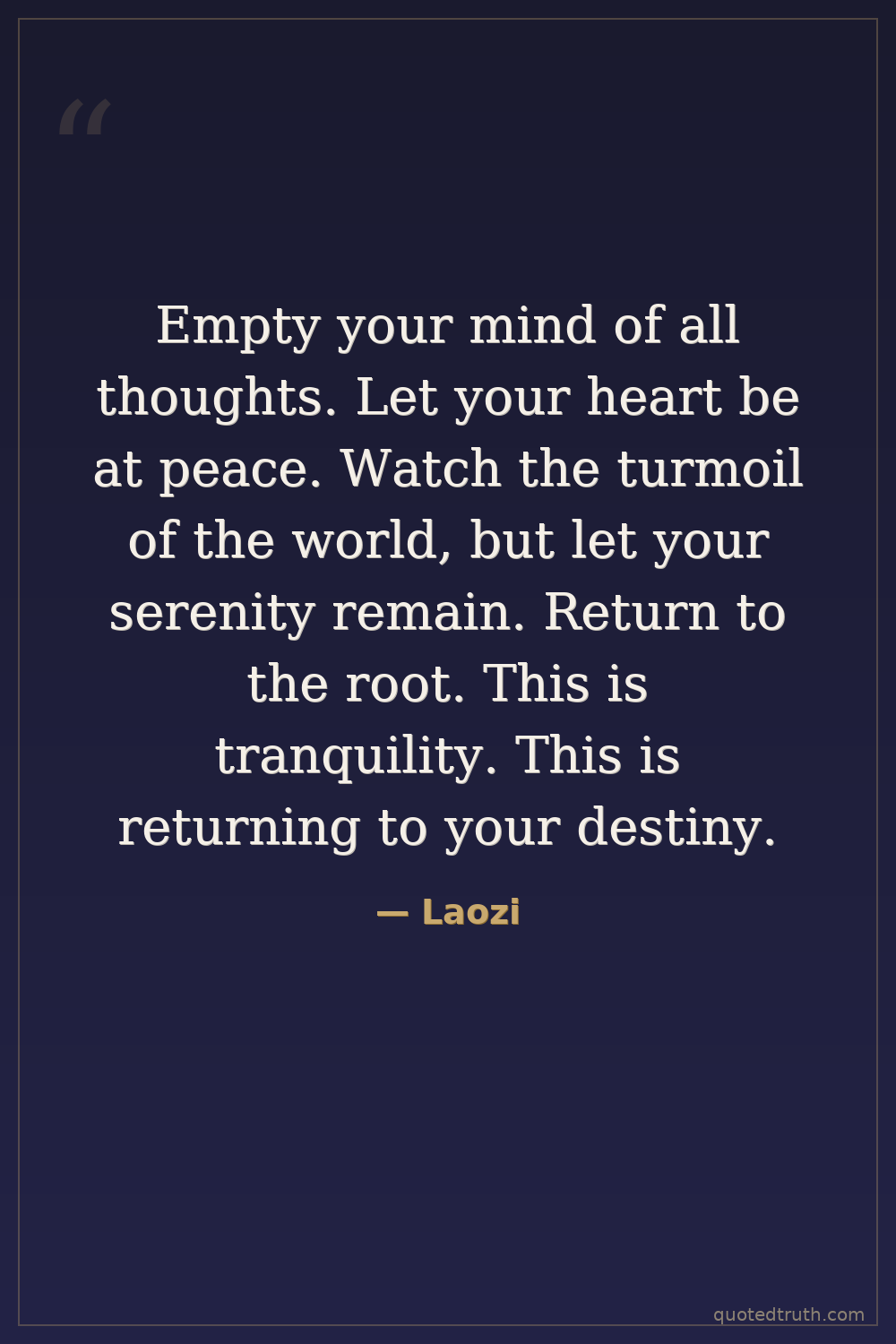 Empty your mind of all thoughts. Let your heart be at peace. Watch the turmoil of the world, but let your serenity remain. Return to the root. This is tranquility. This is returning to your destiny.